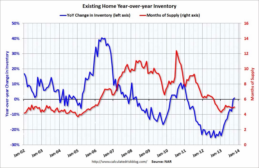 Indeed, housing inventory was down 1.8 percent from September to October, finishing the month at a 5.0-months supply. However, inventory is up nearly a percentage point from a year ago, and as Bill McBride showed on Calculated Risk, inventory has made considerable progress in recent months. So though inventory continues to play a role in housing, it’s likely that traditional seasonal factors also played a role in the slowdown.