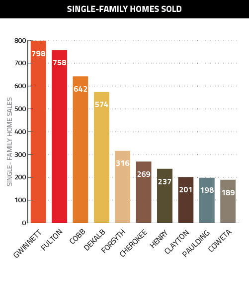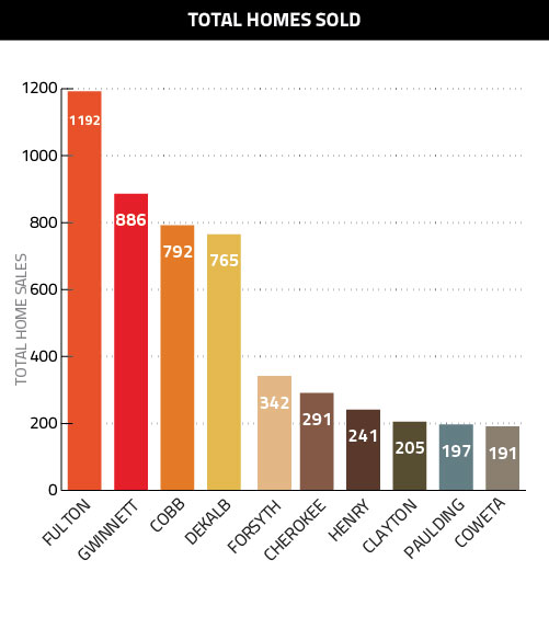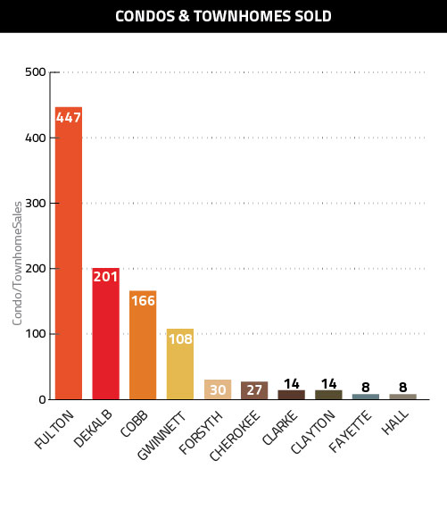 Never before has it been more clear just how single-family friendly Atlanta’s marketplace is, and just how concentrated condo/townhome sales are in Fulton. Consider these two stats: Fulton’s attached sales were more than double that of second-place DeKalb; and the remaining nine counties in that top 10 list accounted for 576 sales, which is just 129 more than just Fulton!