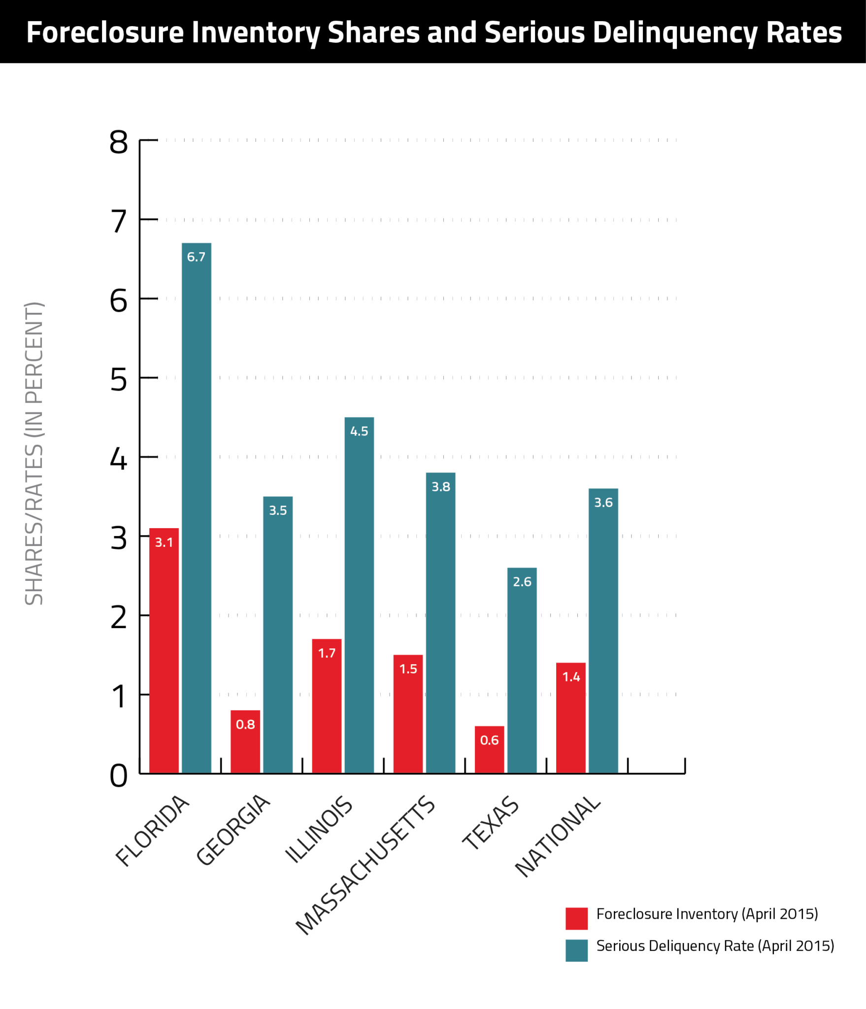 - On a month-over-month basis, the foreclosure inventory was down by 2.2 percent from March 2015. The April 2015 foreclosure rate of 1.4 percent is back to early 2008 levels.