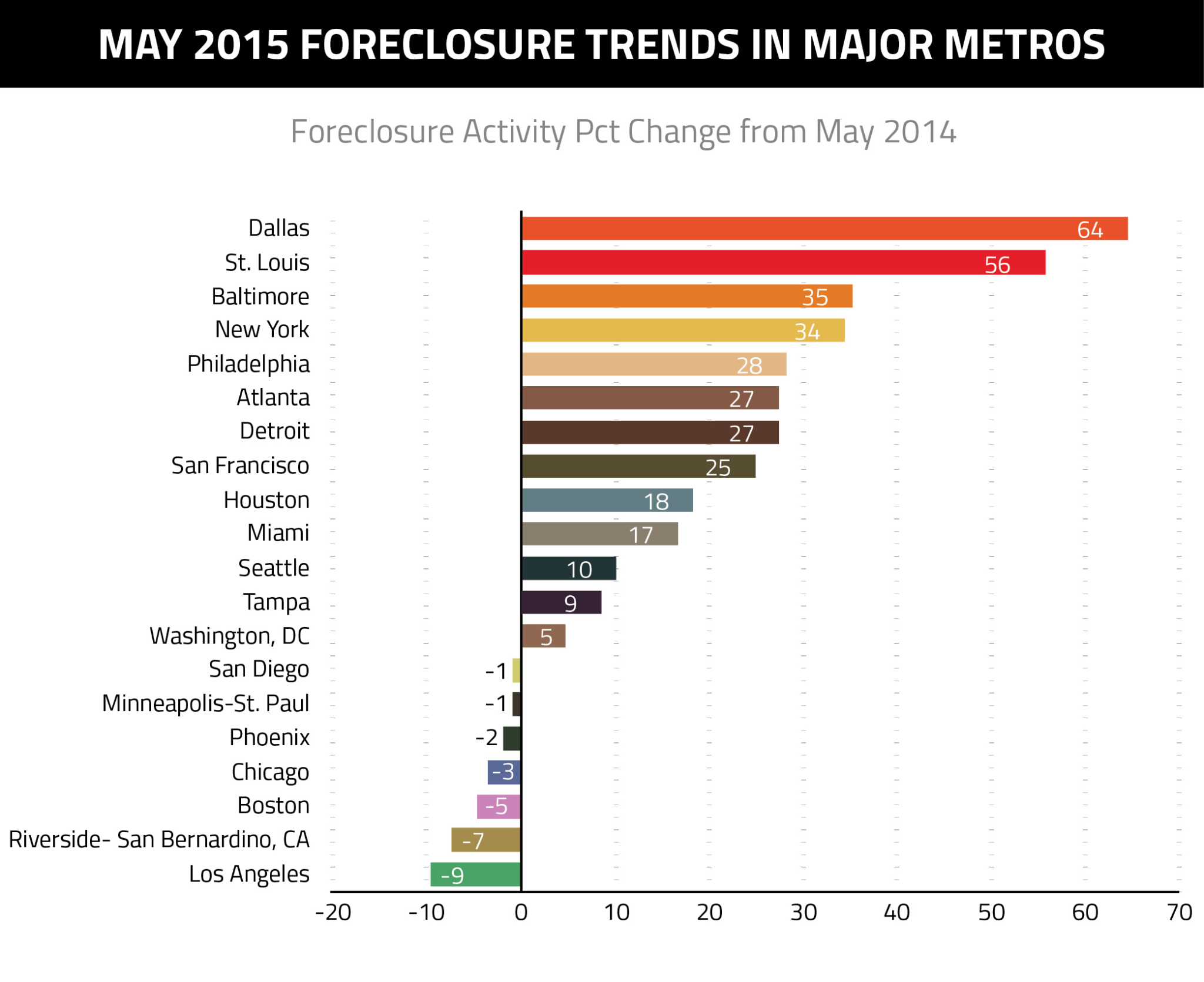 Atlanta was one of 13 metro areas which saw increases in forclosure activity since May 2014. Other cities that saw increases were Dallas (up 64 percent from a year ago), St. Louis (up 56 percent), Baltimore (up 35 percent), New York (up 34 percent), Philadelphia (up 28 percent), Detroit (up 27 percent), San Francisco (up 25 percent), Houston (up 18 percent), Miami (up 17 percent) and Seattle (up 10 percent).