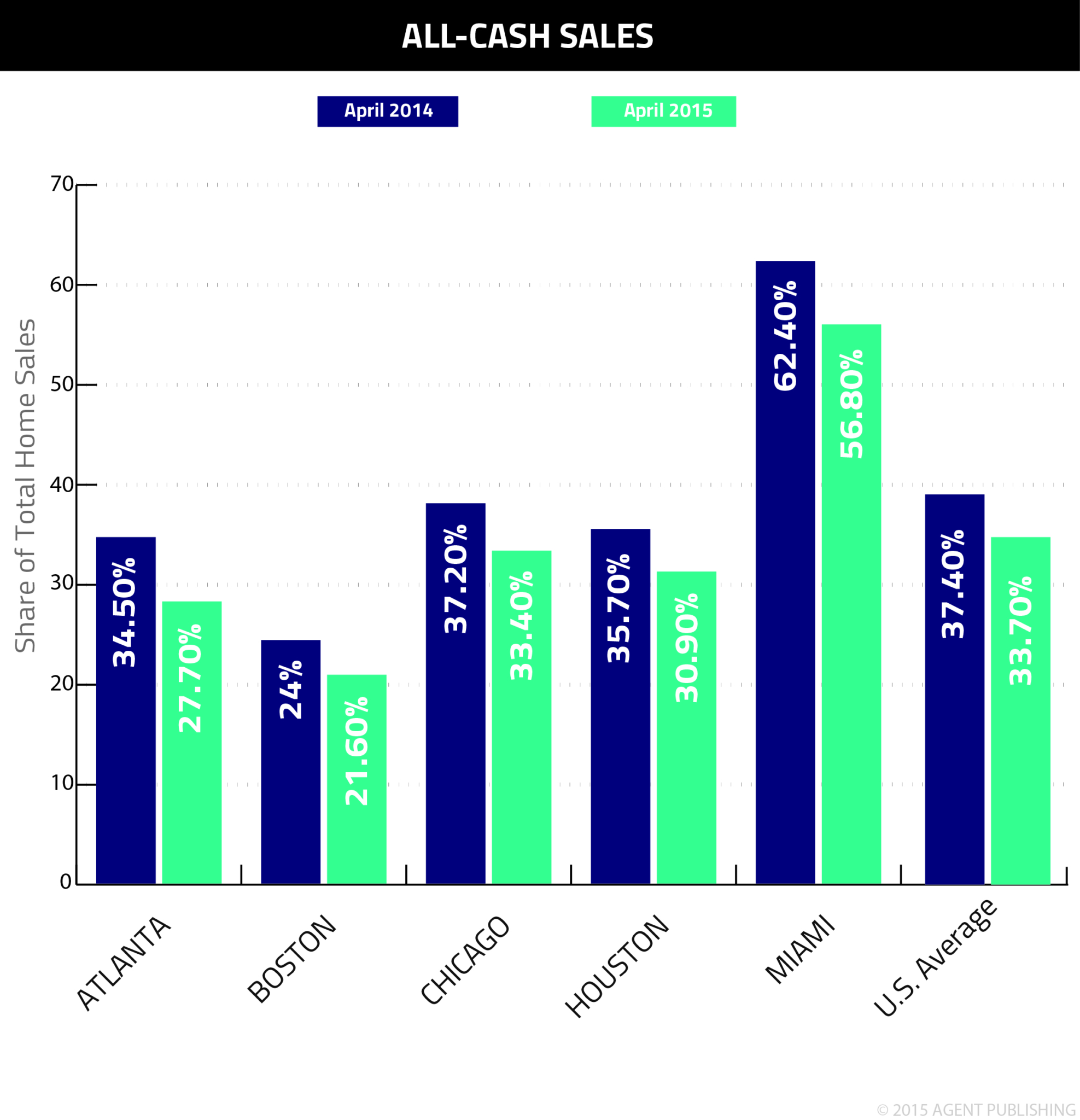 In April, cash sales accounted for 33.7 percent of total home sales. The decrease from 37.4 percent in April 2014 is the 28th consecutive year-over-year decline in cash sales. Since the cash sales peak in Jan. 2011, when market share reached heights of 46.5 percent, a shift in market dynamics has allowed more first-time and traditionally financed buyers to enter and re-enter, leveling price appreciation and dissuading all cash investors to search for quick returns elsewhere.