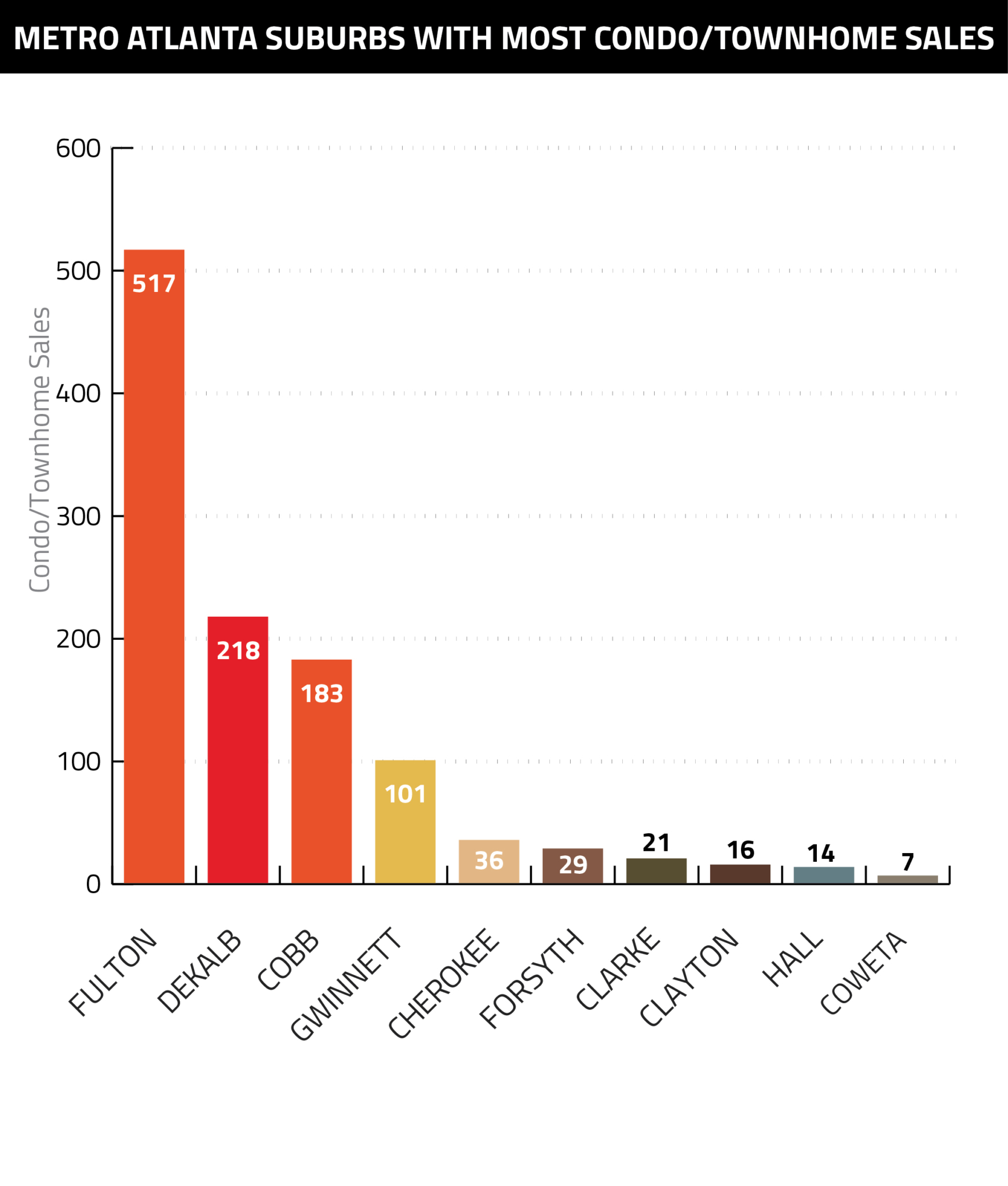 Fulton, which includes 90 percent of the city of Atlanta, had more condo/townhome sales than DeKalb, Cobb and Gwinnett combined, and sales were still up 18.6 percent year-over-year. Third-place Cobb, though, did see its sales rise 23.6 percent.