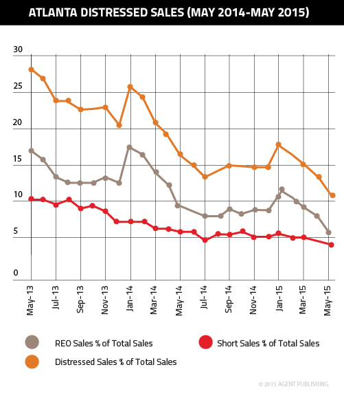 In Atlanta, distressed sales have followed the nation’s trajectory, though trailed somewhat. As our below graph shows, REO and short sales have both lost the large majority of their market shares over the last two years. But in May, at respective levels of 6.49 and 4.96 percent, they are still above “normal” levels.
