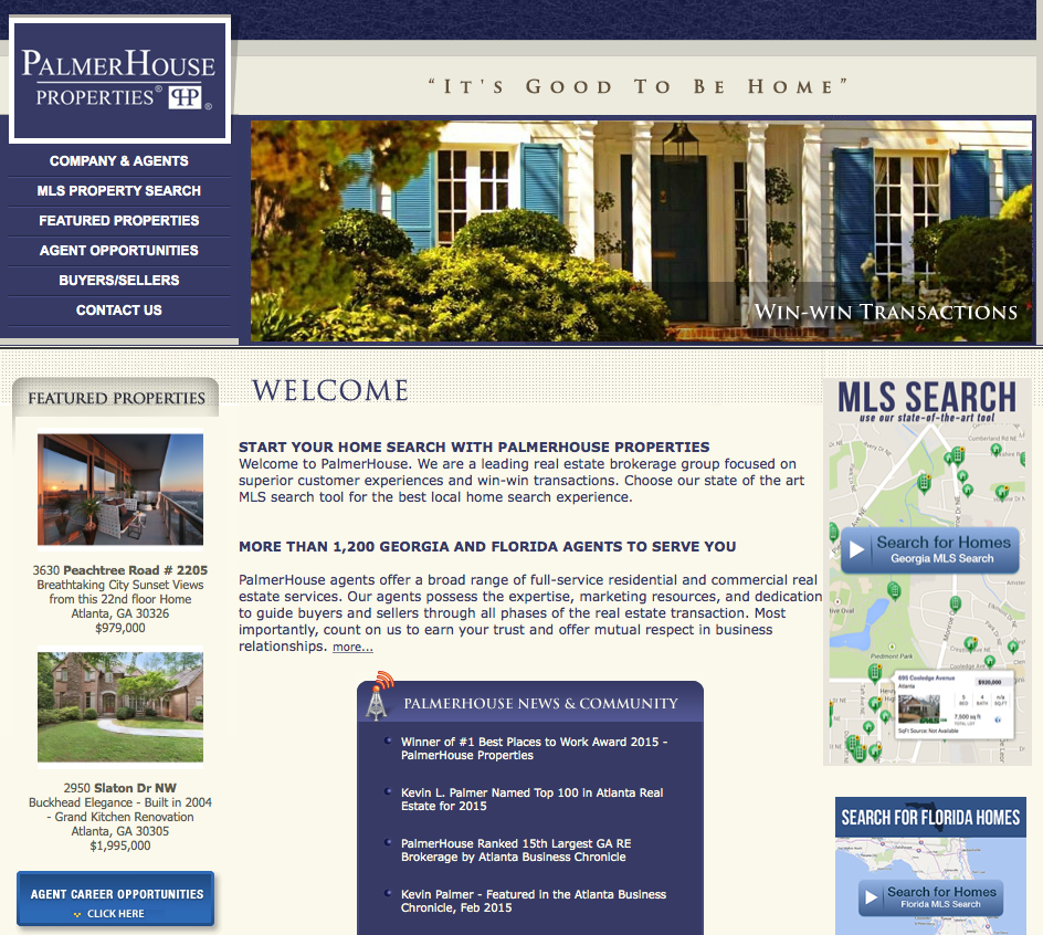 “We are thrilled that the PalmerHouse Properties website (www.palmerhouseproperties.com) has won “Best Website” by Atlanta Agent magazine. This is a very special recognition for PalmerHouse, and we are very appreciative to all those who showed their support. We have strived to create a website that is inviting, easy to use and focuses on both buyers and sellers, as well as real estate professionals. We are committed to providing relevant content and being a vital online resources to home buyers and sellers. With over 90 percent of people using the Internet in their home search, it’s essential for any successful real estate firm to have an engaging, informative and easy-to-use website.” – Kevin Palmer, CEO/founder
