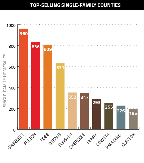 Again, sales were down in all the large counties, and only Coweta and Paulding saw marginal increases. In Gwinnett, sales declined 16.4 percent, while in Fulton, Cobb and DeKalb, they dropped 12.2, 15.3, and 17.4 percent, respectively.