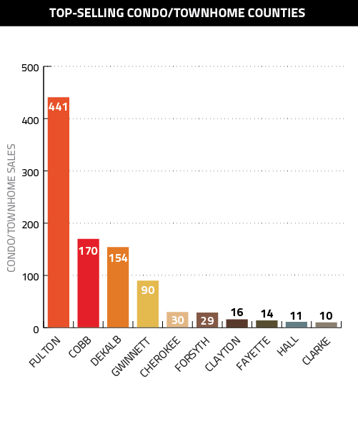 Next, here are Atlanta’s counties with the most condo/townhome sales: