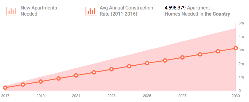 A new study from the Hoyt Advisory Services and commissioned by the National Multifamily Housing Council found that a cumulative 4.6 million new multifamily housing units need to be constructed by 2030 in order to keep up with demand, or an average of 328,000 units per year. However, only an average of 244,000 units have been delivered from 2012 to 2016.