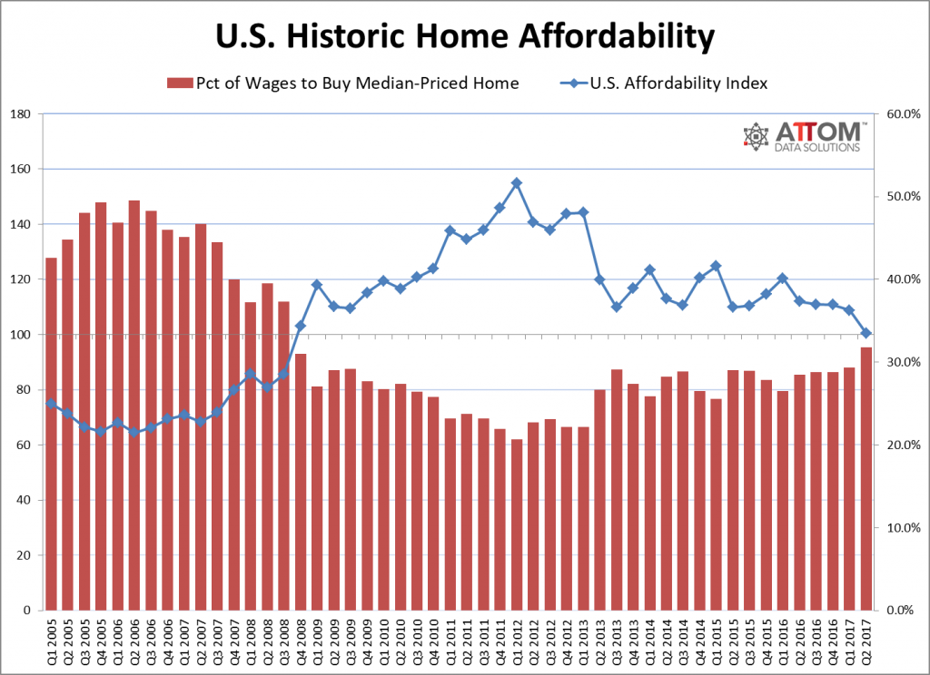 The U.S. affordability index dropped to 100 in the second quarter of 2017, which is the least affordable level since the third quarter of 2008, according to a new report from ATTOM Data Solutions.