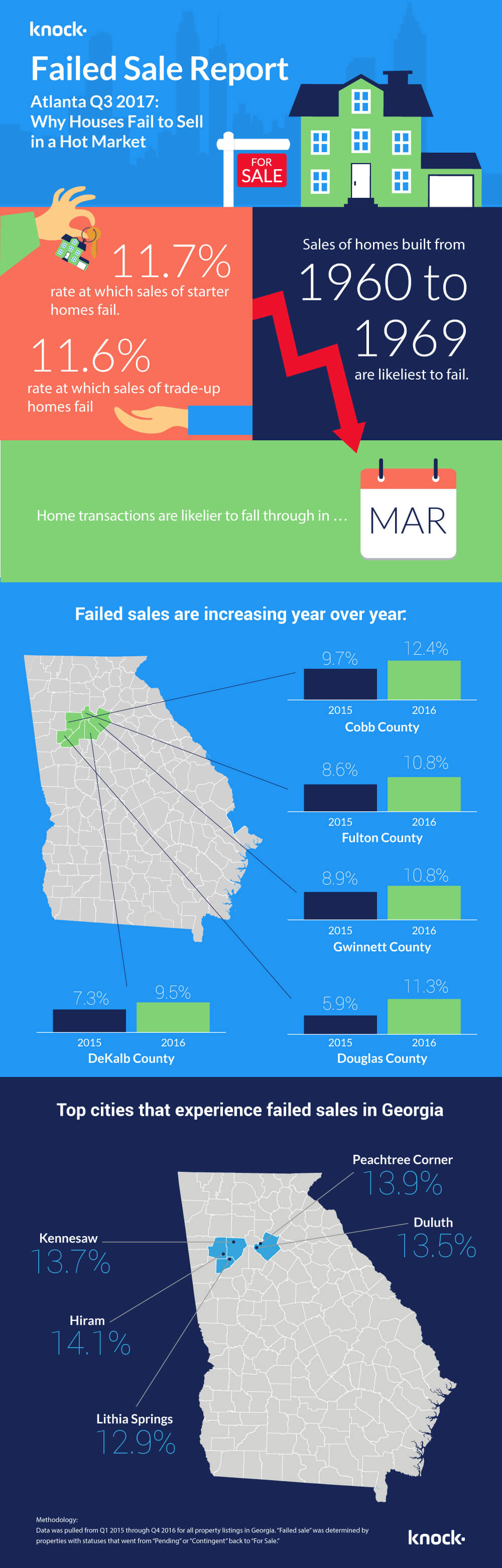 According to a report from Trulia, 10.4 percent of Atlanta’s property sales failed in 2016, which was the third highest rate of failed sales. Knock.co looked into property transactions over the last two years to come up with reasons behind the high failure rate in the city.