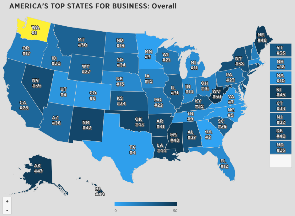 Georgia scored 1,616 this year, which allowed it to jump all the way up from the eighth spot in CNBC’s 2016 ranking. Much of its business growth is due to the fact that Georgia simply has the best economy in the country right now, according to the report. It also placed fourth in workforce and third in infrastructure — the two most prominent categories measured in the study. Washington was the only state to score higher than Georgia at 1,621 points.