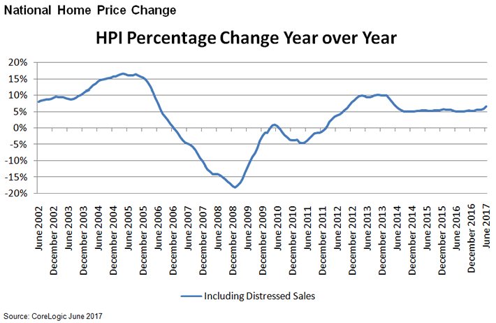Home prices are up nationwide both year-over-year and month-over-month for June, 2017, according to the CoreLogic Home Price Index (HPI) and HPI Forecast. Home prices increased by 6.7 percent from June 2016 to June 2017 and 1.1 percent from May 2017.