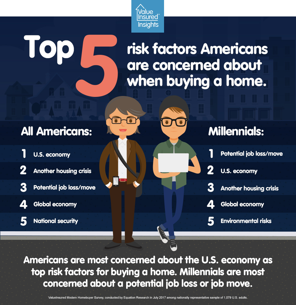 However, the most recent ValueInsured Homebuyer Survey reveals that Americans are just as anxious about the external risks to buying a home as they are about personal ones. The July 2017 report suggests that factors such as shifting economic trends and environmental changes serve as additional causes for concern among those looking to become homeowners.