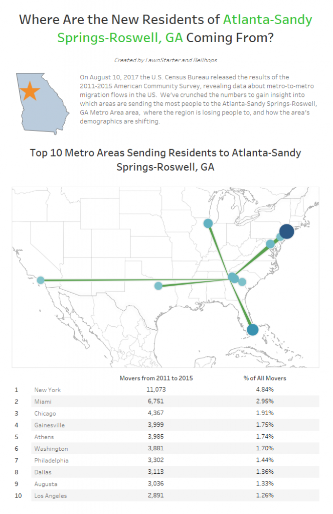 The top area sending residents to the Atlanta-Sand Springs-Roswell MSA is the New York-Newark-Jersey City MSA, according to LawnStarter and Bellhops Atlanta’s analysis of recent Census data.