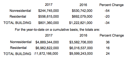 Total building starts last month increased 24 percent year-to-date increase over September 2016 to $11.87 million from about $9.6 million.