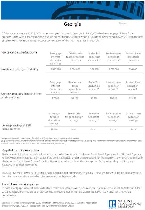 Approximately 65 percent of the 2.27 million owner-occupied homes in Georgia last year had a mortgage, according to NAR. Of those, 7.9 percent had a mortgage of more than than $500,000 while 1.3 percent of the owners paid more than $10,000 in real estate taxes. The average mortgage interest deduction taken by Georgia homeowners was around $7,550 in 2016 while the real estate tax deduction average was $3,100.