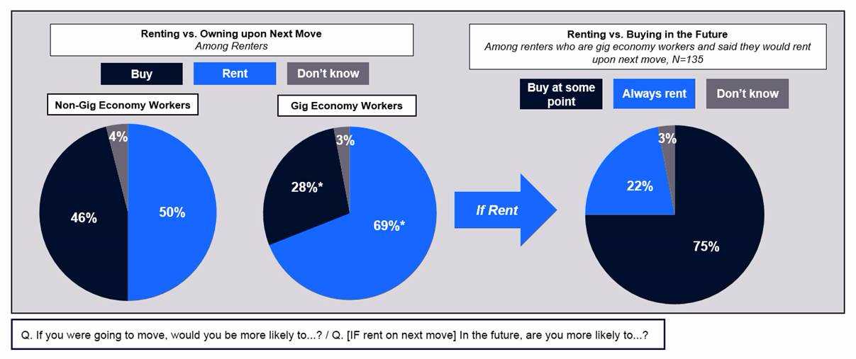 In terms of actually purchasing homes, however, participants in the gig economy aren’t as confident. According to the study, most gig workers who currently rent think it’s too difficult to get a mortgage because they can’t afford to a down payment or their credit will disqualify them. However, most stated a desire to own a home rather than rent, but are scared away by the current housing market and don’t plan on buying anytime soon. They do remain optimistic about buying in the future, however.