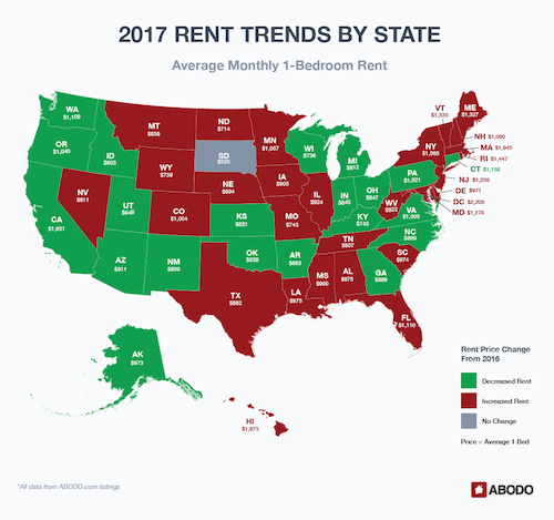 In its annual rent report, ABODO found that despite a slight dip in the number of renters, rent prices increased across the country this year, with the national median rent for one-bedroom units increasing by 2.4 percent. Two-bedroom rentals were 3 percent higher by the end of 2017 than they were in the beginning.