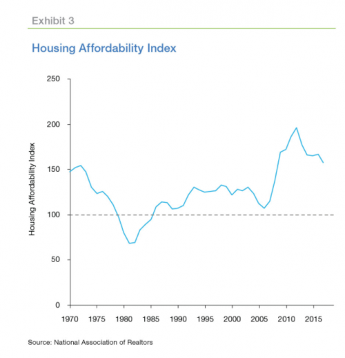 The National Association of Realtors’ Housing Affordability Index, which measures the median family income necessary to qualify for a conventional mortgage on the median-priced home, has been declining since its peak in 2012; however, it has yet has not fallen below the historical average. This trend indicates that eventually housing market activity will be slowed as affordability drops.
