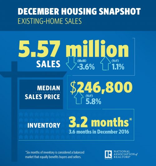 In December, the median existing home price for all housing types was $246,800, up 5.8 percent from $233,330 from December 2016.