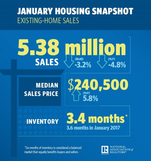 Existing-home sales fell 3.2 percent in January for the second consecutive month, according to the National Association of Realtors. Last month’s total existing-home sales, including single-family homes, townhomes, condominiums and co-ops, saw the largest annual decline in more than three years. All major regions experienced monthly and annual sales declines in January.