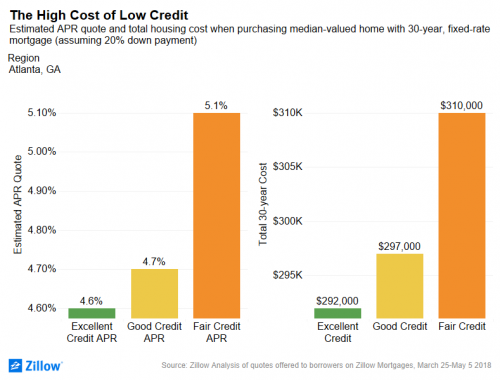 Atlanta buyers with fair credit scores are paying on average about $18,000 more for a home than someone with an excellent score. A buyer with fair credit in the city could get a 5.10 percent APR while someone with excellent credit could get a 4.70 percent APR.