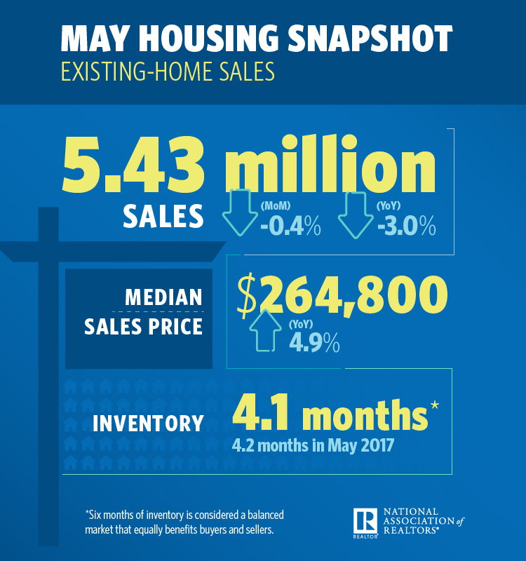 Existing-home sales fell 0.4 percent in May to a seasonally adjusted annual rate of 5.43 million, according to the latest report from the National Association of Realtors. Sales have fallen year-over-year for three months and is 3 percent lower than a year ago. Excluding the Northeast, every region saw lower sales for single-family homes, townhomes, condominiums and co-ops, and on an annual basis, every region saw declines.