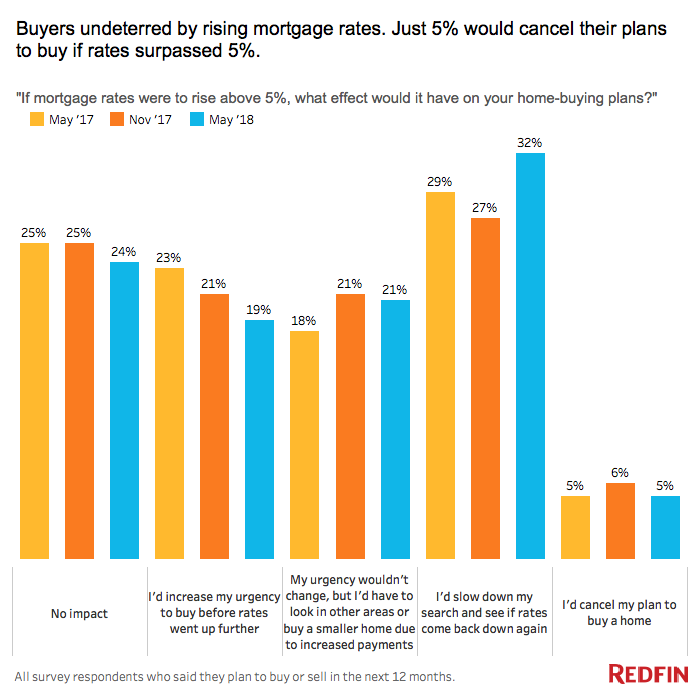 Last month, Redfin conducted a survey of more than 4,000 people who bought or sold a home in the last year, attempted to, or planned to do so soon. Of those people, 1,300 planned to buy a home within the next year. Only 5 percent of them said that they would halt their search for a home if mortgage rates rose higher than 5 percent. On the other hand, 24 percent of potential buyers said that the increase would not change their mind and have no impact on their search for a home.