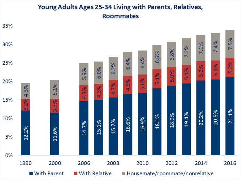 Living with parents is the most popular option. In 2016, 21.1 percent of young adults, or 9.4 million, lived with parents in 2016. The number nearly doubled from the 11.6 percent of young adults who lived with parents in 2000.