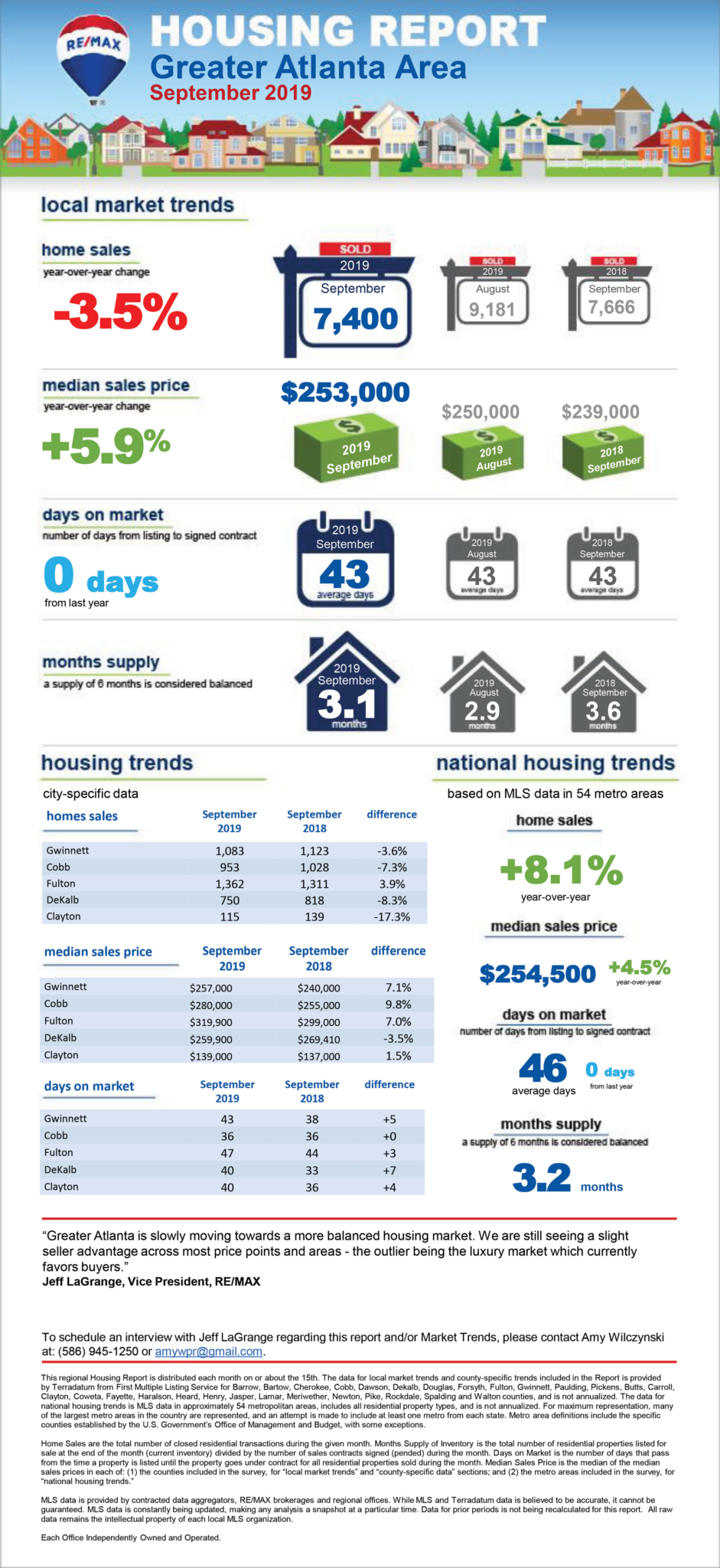 “Greater Atlanta is slowly moving towards a more balanced housing market,” Jeff LaGrange, who oversees regional operations in RE/MAX’s southeast region, said in the news release accompanying the report. “We are still seeing a slight seller advantage across most price points and areas — the outlier being the luxury market, which currently favors buyers.”