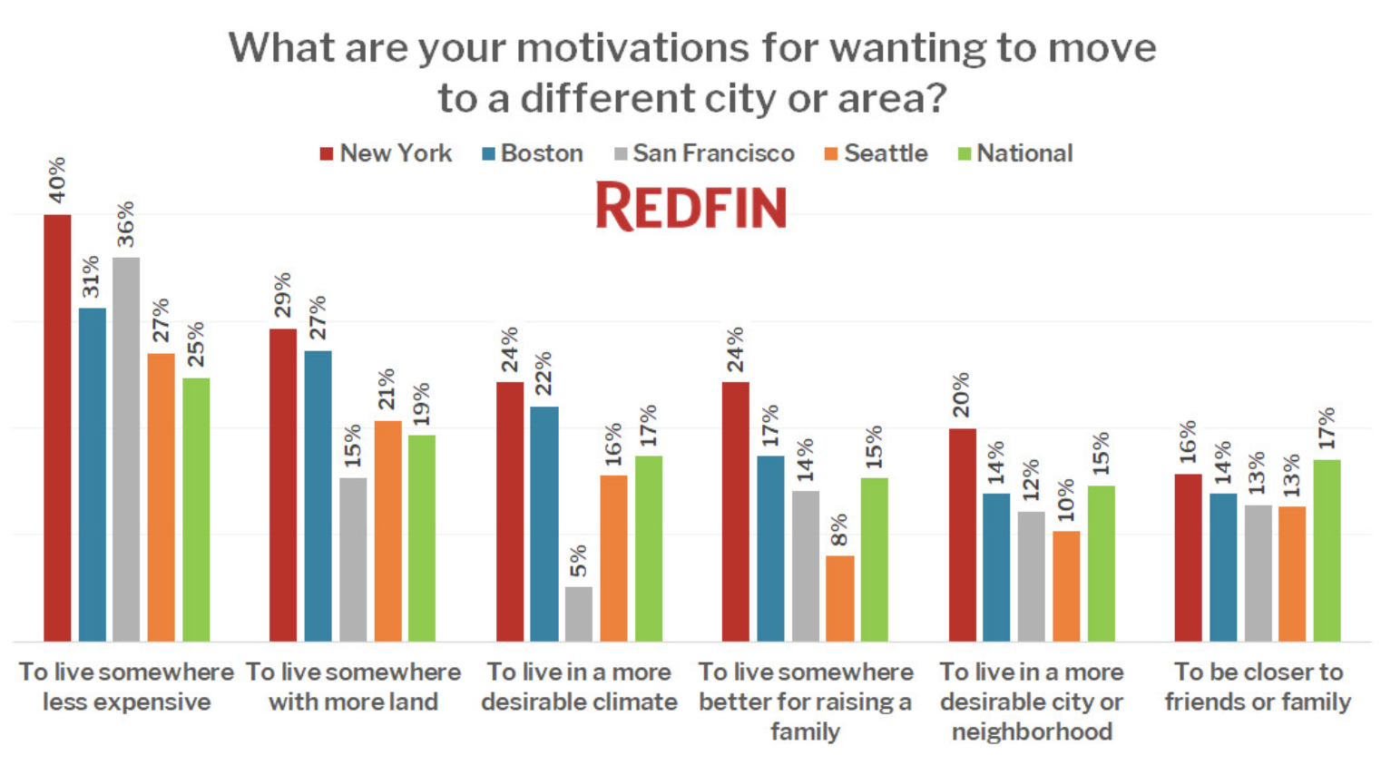 Though the pandemic is certainly driving the thought process about working from home, the high cost of living was the biggest reason respondents in New York, San Francisco, Boston and Seattle wanted to leave. The desire for more land, a better climate, a better place to raise a family, a more desirable city or neighborhood and proximity to friends and family were other motivators for respondents wanting to move.
