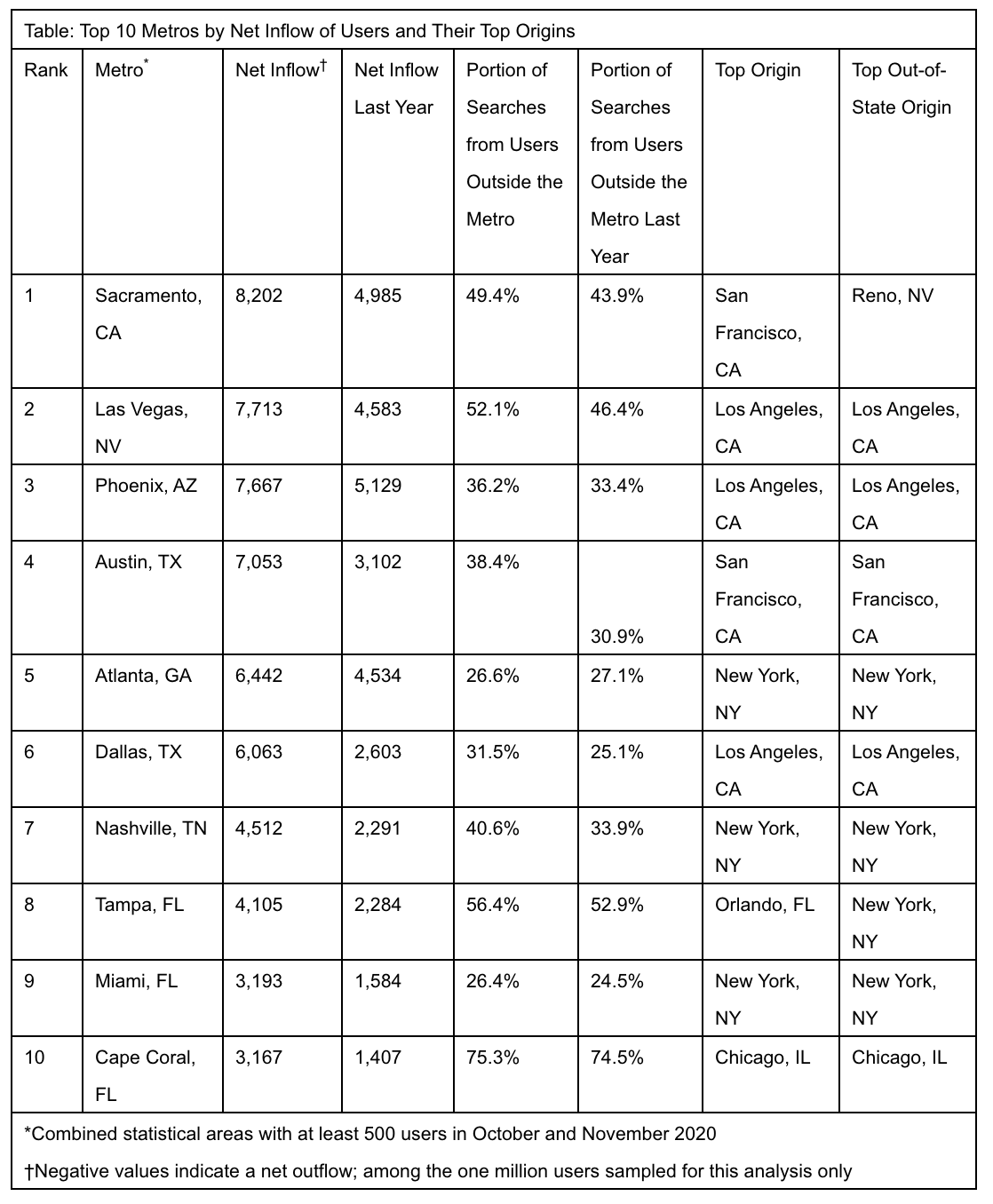 Atlanta had a net inflow of 6,442 in October and November, meaning that’s how many consumers looked to move in. The net outflow — those looking to leave — was much smaller at 4,534. The top origin of searches was from people in New York City.