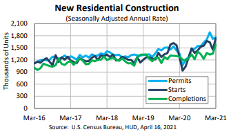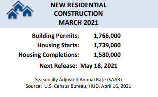 Privately owned housing starts jumped 19.4% from February’s revised estimate to a seasonally adjusted annual rate of 1,739,000, according to the U.S. Census Bureau and the Department of Housing and Urban Development. Year over year, that represents a 37% gain from the March 2020 rate of 1,269,000.
