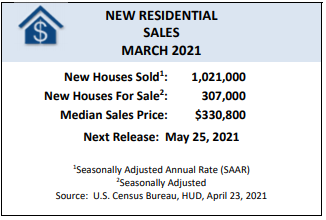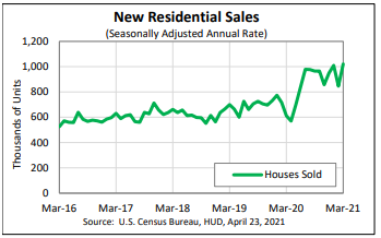 Sales of new single-family homes rose 20.7% month over month in March to a seasonally adjusted annual rate of 1,021,000, the U.S. Census Bureau and the Department of Housing and Urban Development said in a release.