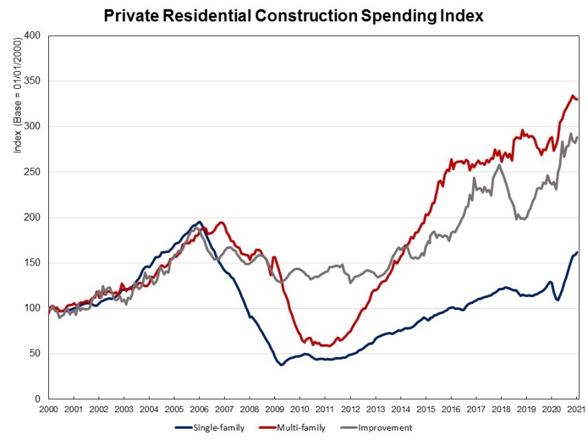 The NAHB attributed the monthly increase in its construction spending index to single-family construction and single-family improvements, both of which rose by 2% on a monthly basis. Multifamily construction, meanwhile, declined 0.3% after falling 0.9% in February.