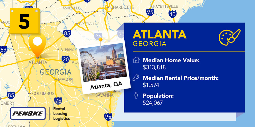 Atlanta was once again named a top moving destination by Penske Truck Rental in its 11th annual Top Moving Destinations list, which is released every May to mark National Moving Month. The company used one-way inbound truck rental data to rank Atlanta as the fifth top destination for Americans, down from No. 2 last year.