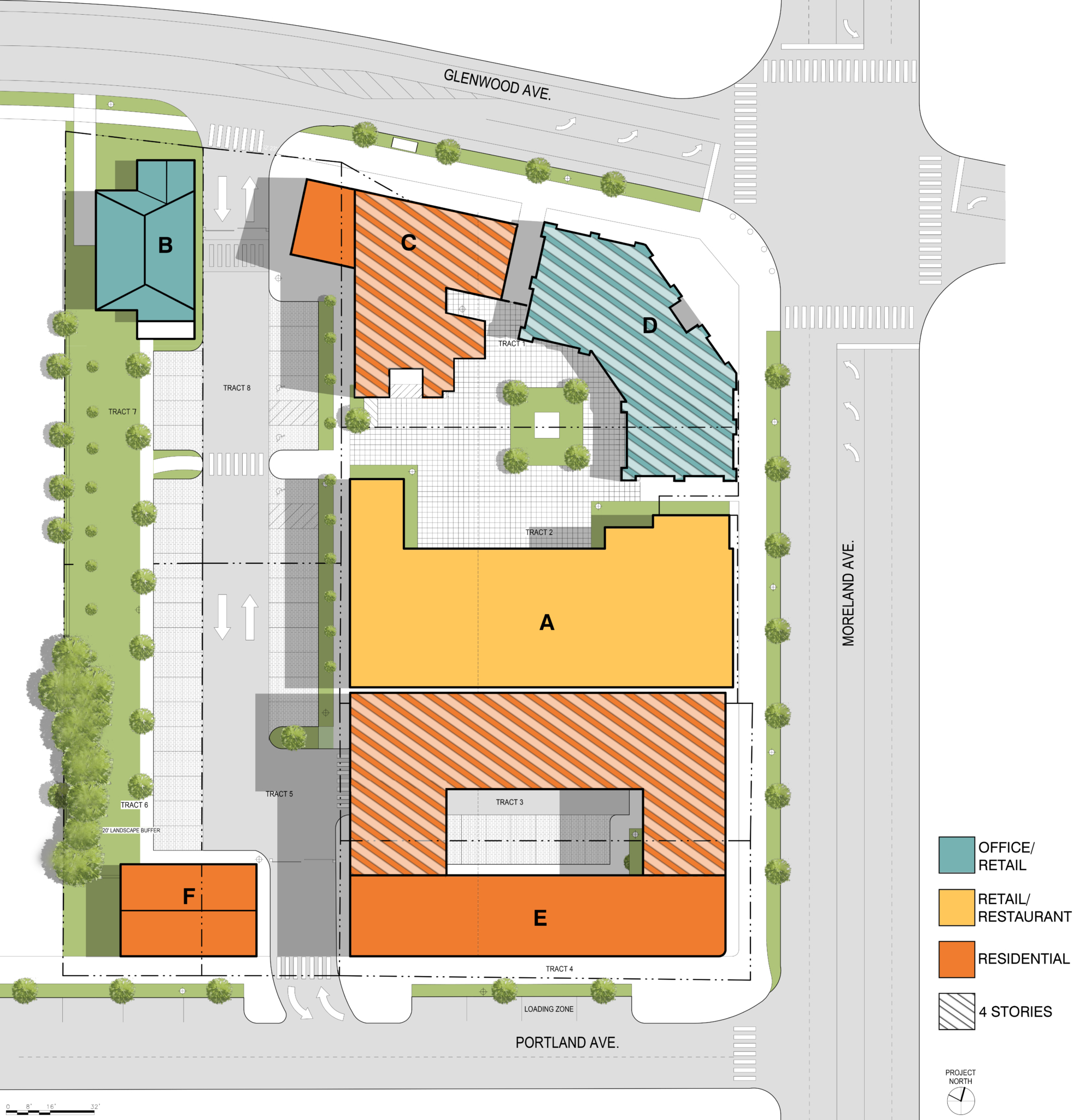 The 525 Moreland project is an assemblage of eight properties on the southwest corner of the intersection of Glenwood and Moreland avenues, according to its website. Three of the five structures will hit four stories, with others reaching lower elevations. The centerpiece of the development will be the historic Masonic Lodge building that will be repurposed for commercial use, with a market/food component on the first floor in recognition of its original use as a Kroger grocery store. The master-planned project will also include a 5,000 square-foot plaza and a 7,500 square-foot green-space buffer with neighboring residences.