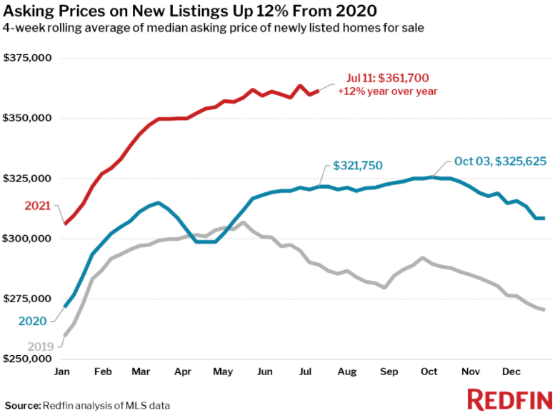 A record 55% of homes sold above list price, which is up from 28% a year earlier, Redfin said. However, this measure appears to be plateauing, as it has been at 54% to 55% since the four-week period ended June 27, Redfin said.