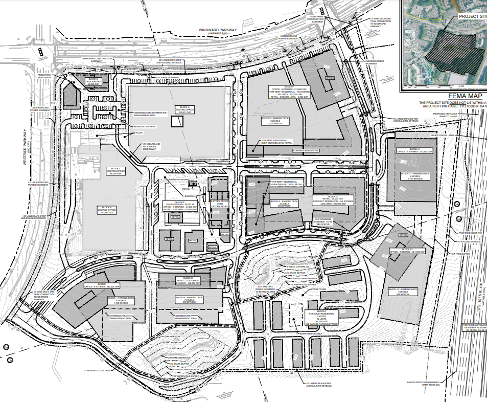 A San Diego developer has proposed a massive mixed-use project on the 51.88-acre site of the Hewlett-Packard Enterprise corporate office at the intersection of Windward Parkway and Westside Parkway in Alpharetta.