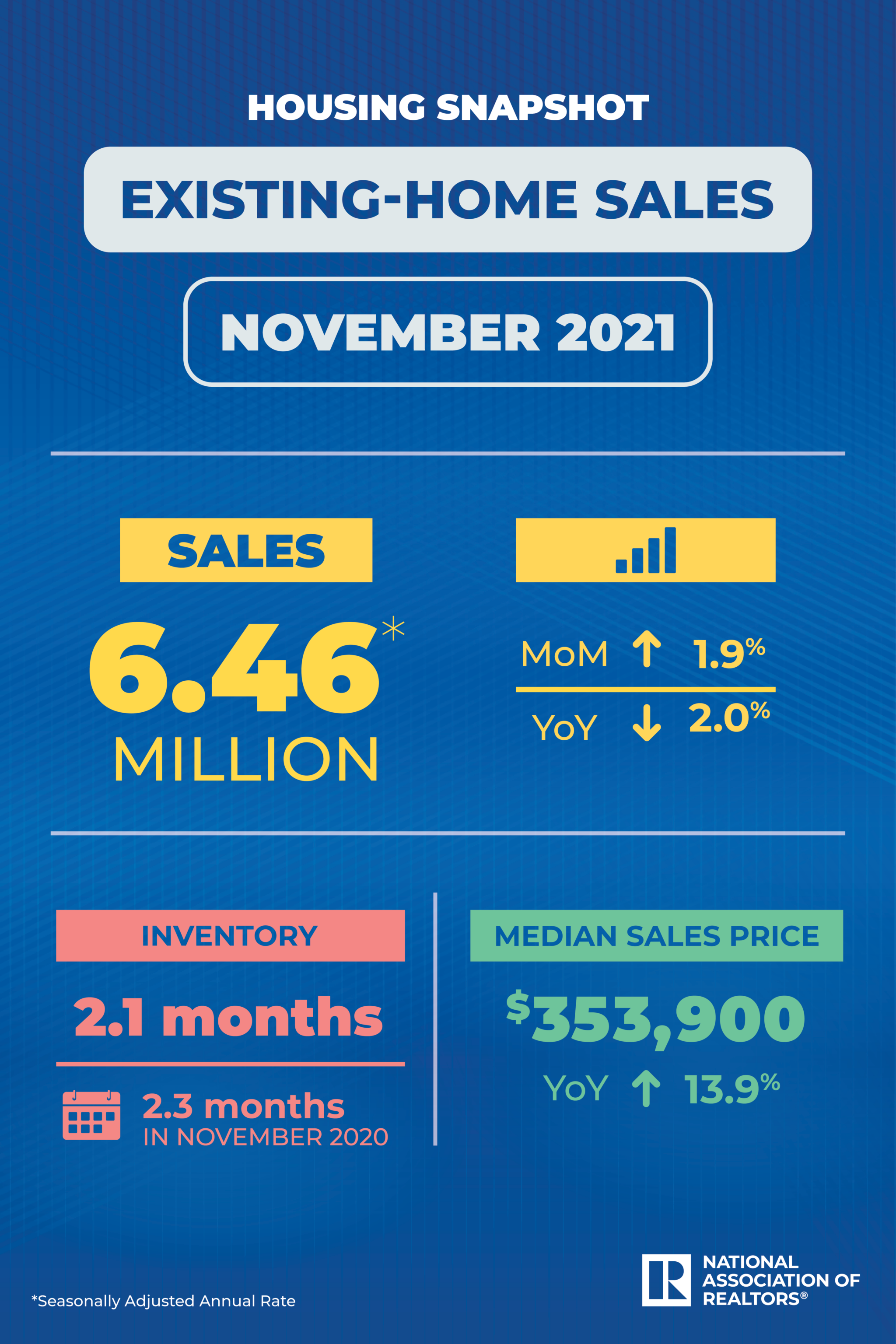 Total existing-home sales, which are completed transactions, including single-family homes, townhomes, condominiums and co-ops, rose 1.9% from October to a seasonally adjusted annual rate of 6.46 million in November. Year over year, sales were down 2% from 6.59 million transactions in November 2020.
