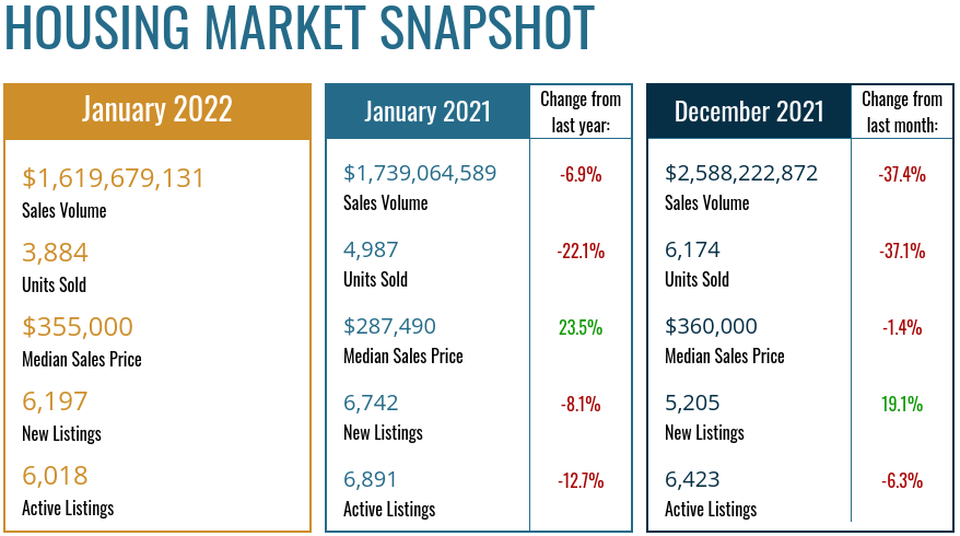 Sales volume by dollar amount fell precipitously, declining 37.4% from $2.59 billion worth of transactions in December to $1.62 billion in January. Last month’s sales total was down 6.9% from the $1.74 billion worth of transactions in January 2021.