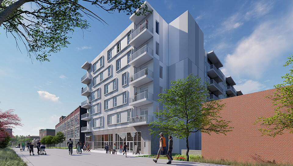 The community, which is being designed by Praxis3, will include 71 one-bedroom, one-bath units; 36 two-bedroom, two-bath units and nine three-bedroom, two-bath units, as well as 2,700 square feet of commercial or retail space.
