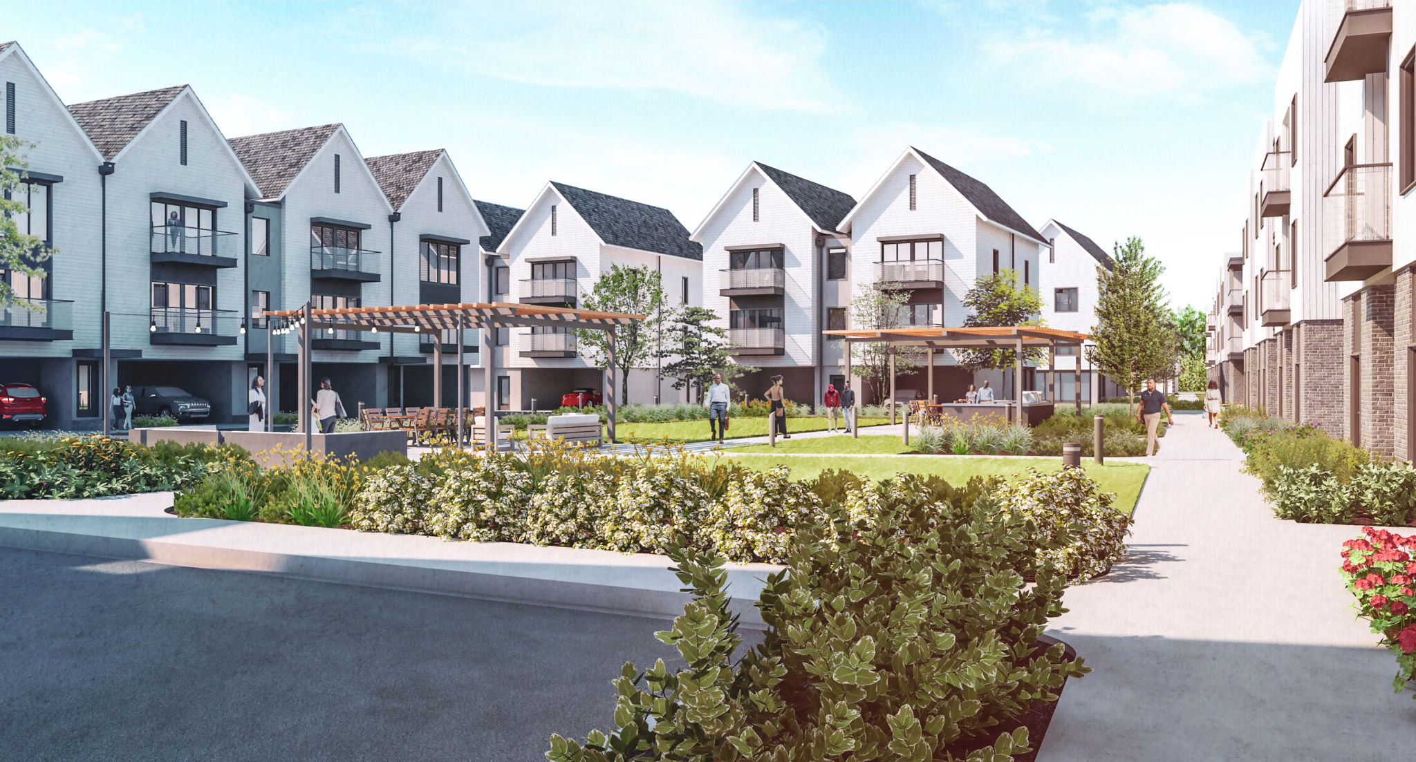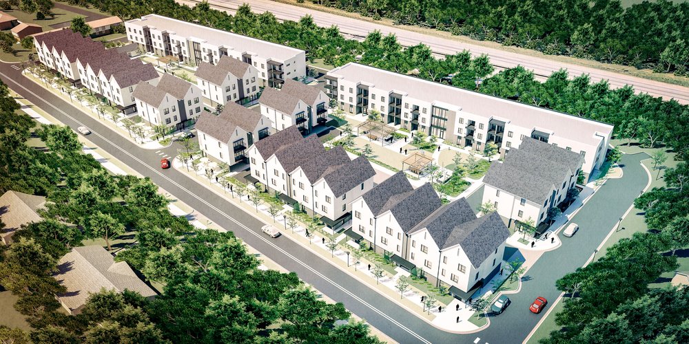 Community amenities will include a resort-style clubhouse, pocket parks, walking trails, community garden and on-site lifestyle concierge. Rendering courtesy of The Kourtney at Yates Road.