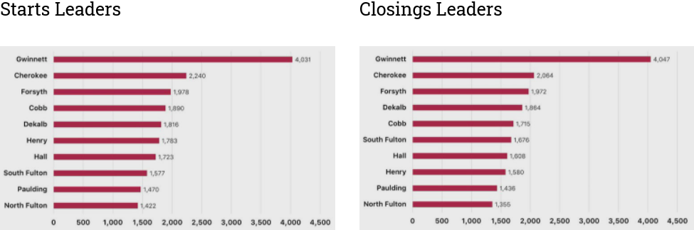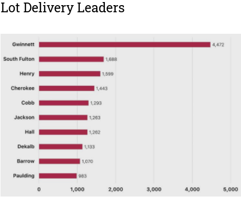 During the first quarter, Gwinnett County recorded 4,031 starts on an annualized basis, compared to the next most-active county, Cherokee, with 2,240. Gwinnett saw 4,047 annualized closings, compared to Cherokee’s 2,064, and had 4,472 lots delivered during the quarter, followed by South Fulton, with 1,688 lots.