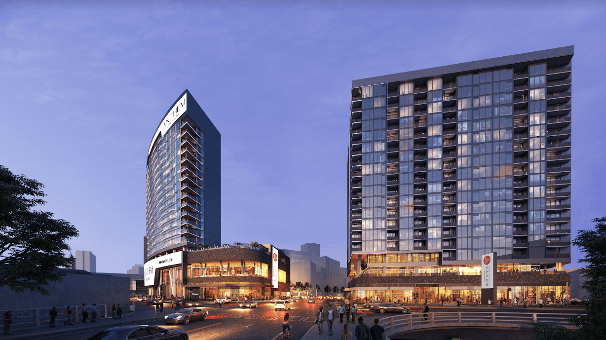 Anthem’s guest rooms will average more than 400 square feet each, while the apartment tower will offer units in multiple layouts, from studios to three bedrooms. Together, the towers will have 21,000 square feet of ground-level retail and restaurant space and provide a new public green. Anthem will have a rooftop offering views of key Downtown attractions.