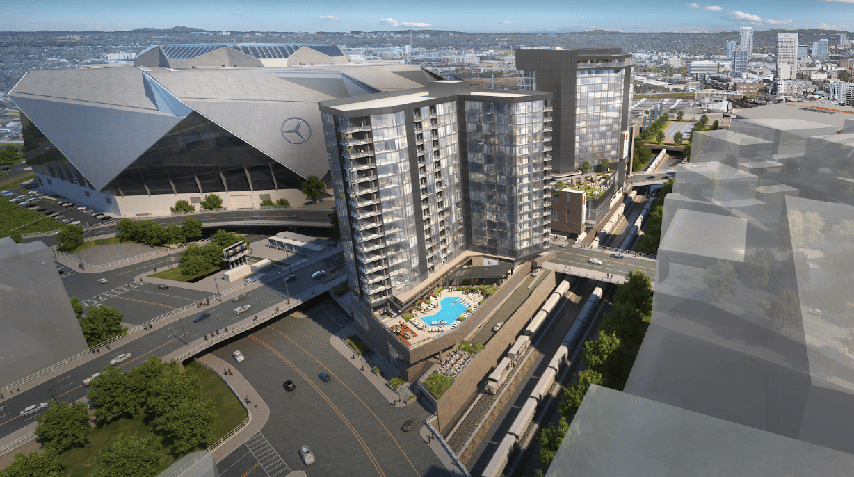 Both 18-story buildings are across the street from Mercedes-Benz Stadium and are slated for completion in 2025, ahead of the 2026 World Cup.