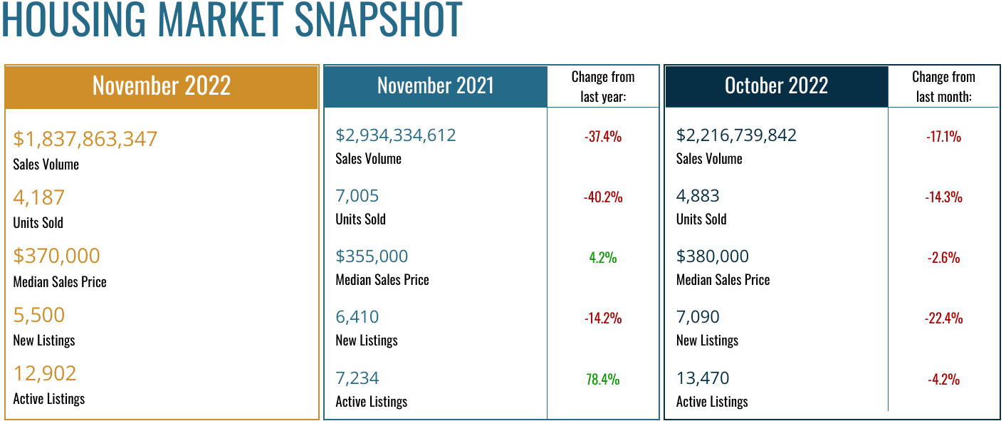 The median sales price of homes sold was $370,000, down 2.6% from October but up 4.2% from November 2021.