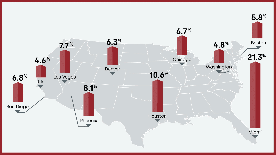 Miami posted the highest annual increase among the country’s 20 largest metro areas, at 21.3%, followed by Houston at 10.6% and Phoenix at 8.1%.