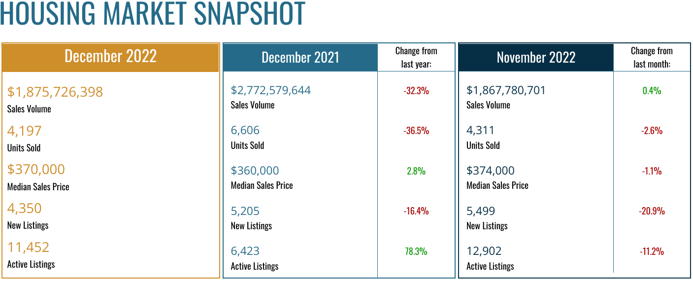 The median sales price of homes sold was $370,000, up 2.8% from $360,000 in December 2021 but down 1.1% from $374,000 in November.