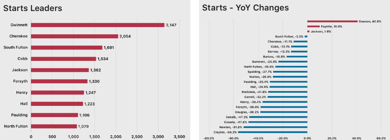 Of the 23 counties analyzed by St. Bourke, 20 experienced year-over-year declines in housing starts, and 17 saw declines in closings, while 12 saw lot deliveries decrease. Meanwhile some counties saw dramatic swings in deliveries, with deliveries in Rockdale, Douglas and Newton surging well over 100% over the last year. However, in Fayette, Hall and Carroll they fell by high double-digits.