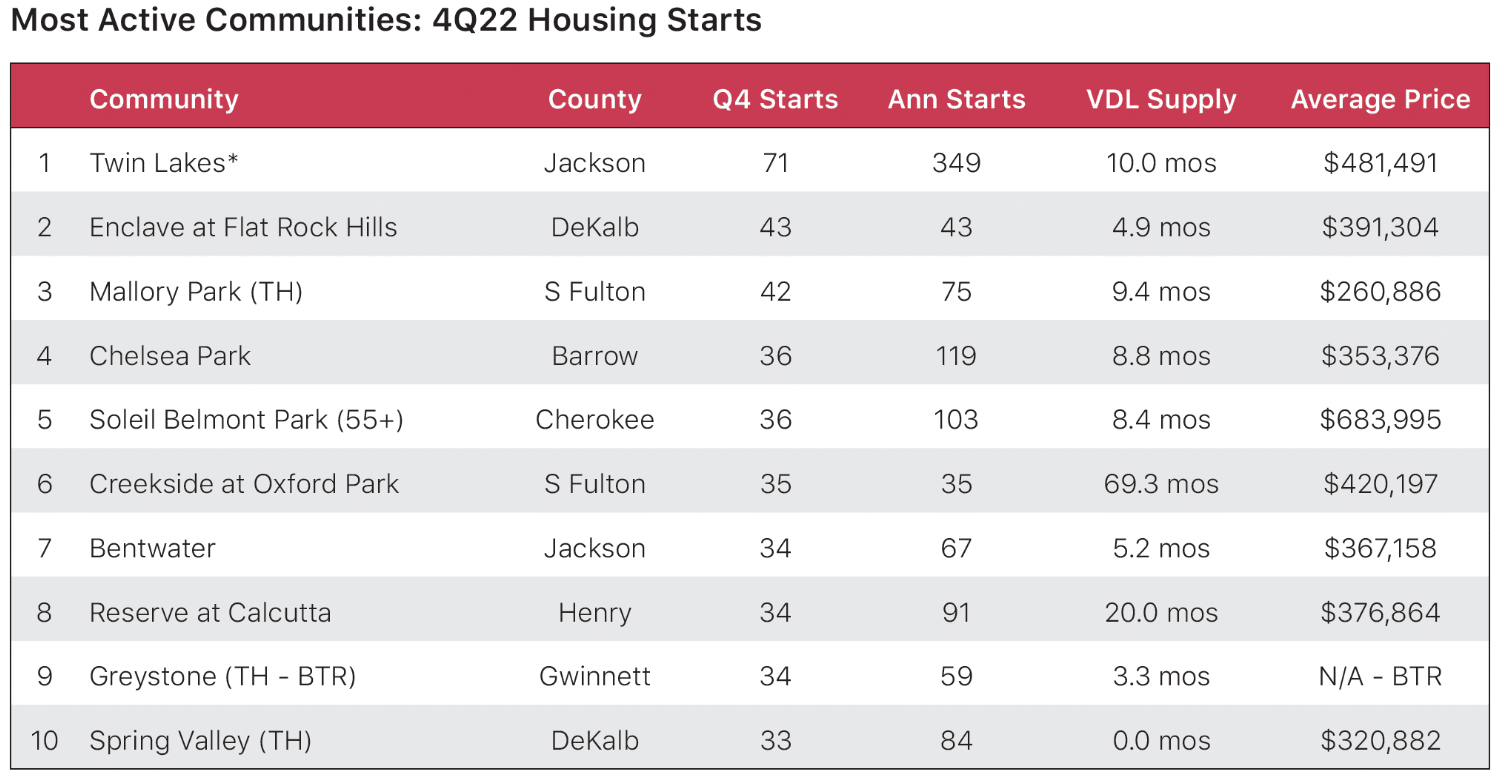 By community, Twin Lakes in Jackson County was the most active for new construction in the fourth quarter, with 71 starts, followed by the new Enclave at the Flat Rock Hills development in Dekalb County with 43 starts. The Mallory Park townhome community in South Fulton was third with 42 starts.